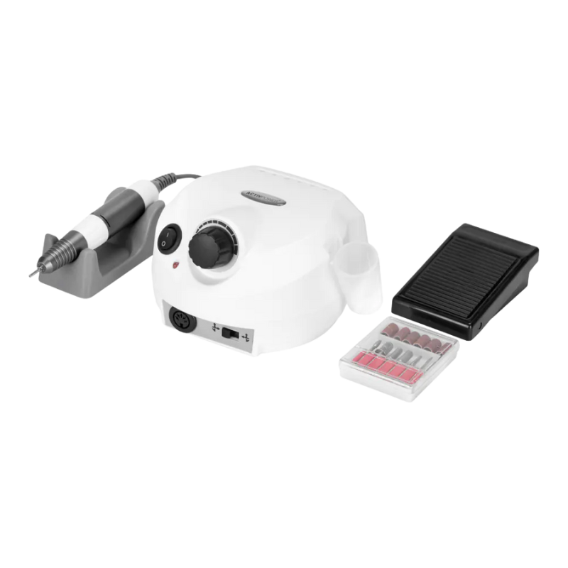 Powerful and versatile electric nail file with 65W power, ideal for professional manicure and pedicure. It offers speed control from 0 to 35,000 RPM. The device has an operation indicator (red LED), a switch for changing rotation direction, and the ability to switch control between handpiece and foot pedal. The ergonomic handpiece is well-balanced and equipped with a Twist-Lock system for quick attachment changes.